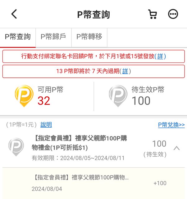 默默又收到PC爸爸派發的P幣了… 各位可以抽空查看,因為它發放條件可以說是沒有什麼準則XD 有可能某帳號連續幾次都有(只是每次金額可能不同)、有可能某帳號怎樣就是沒有XD 另外它都是先發放、隔天才會生效。所以你在主頁面的地方看到可能是0P幣,要再點進去下 個頁面,看一下「待生效P幣」那邊有無顯示金額。 有的話可以先準備一下要買什麼,祝各位消費愉快XD https://i.imgur.com/b98F5ro.png