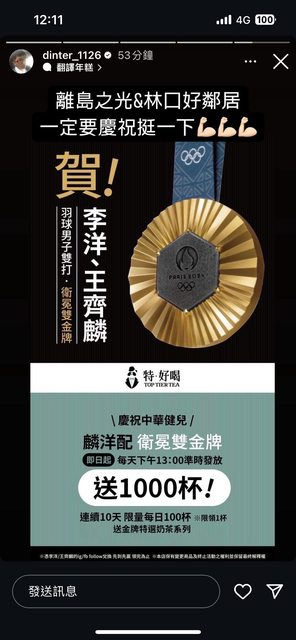 如題 我們電競教父丁特開的飲料店 慶祝奧運羽球男雙奪金 https://i.imgur.com/S6tppT6.jpeg