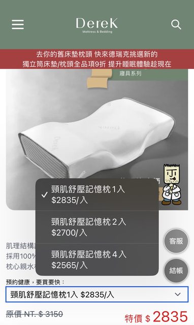 德瑞克和三個字物理治療師合作的這顆記憶枕 平常沒什麼折扣(如果沒記錯的話) 這個月的活動看到單顆也有9折 2入以上會更便宜 https://i.imgur.com/H742A5J.jpeg