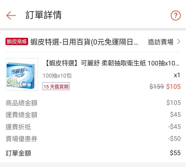 可麗舒 柔韌抽取衛生紙 100抽x10包 售價$105 運費$45 免運-$45 賣場優惠券-$50 最終價格$55 http://i.imgur.com/ZW2fdq2.jpg