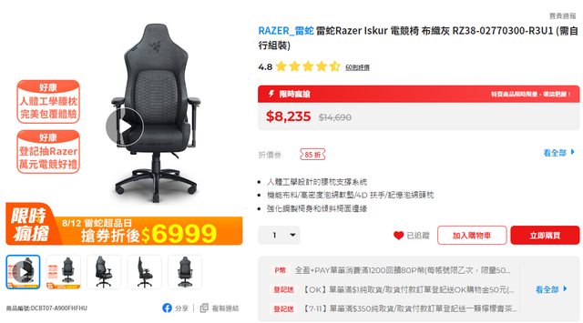 PC+的雷蛇超品日這次折扣還行,而且搭配的滿額活動都還不錯 https://reurl.cc/XRl5o0 1.滿$999有88折券可以用(另外滿額最高可以送到1000P) 2.鍵鼠滿2990送雷蛇滑鼠墊 3.滿1萬元登記抽Microsoft 365/滿2萬元登記抽羅技LIFT無線滑鼠 4.滿$1登記抽雷蛇萬元好禮 商品部分,應該就屬電競椅+滑鼠折扣最多 RAZER ISKUR 券後價格6999 https://reurl.cc/WNXqje https://i.imgur.com/Ue79dOa.png