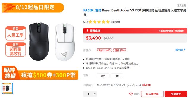 Razer Deathadder V3 Pro 折後2990+300P https://reurl.cc/QE6W8p https://i.imgur.com/pUfn5AC.png