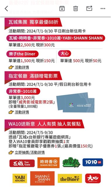 瓦城88折 大心也有9折 不過服務費是另外加 剛好有要去可以先抽獎 碰碰運氣 https://i.imgur.com/o5syw9p.jpeg