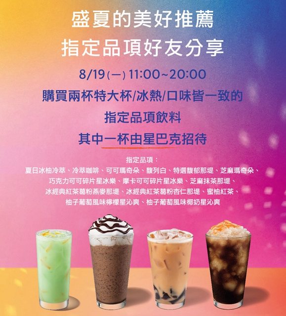 盛夏推薦 指定品項好友分享日 活動期間11:00-20:00至全台星巴克門市,購買兩杯特大杯冰熱/口味皆一致的指定品項飲 料,其中一杯由星巴克招待。 指定品項好友分享活動品項如下: 夏日冰柚冷萃、冷萃咖啡、可可瑪奇朵、馥列白、特選馥郁那堤、芝麻瑪奇朵巧克力可 可碎片星冰樂、摩卡可可碎片星冰樂芝麻抹茶那堤、冰經典紅茶葛粉燕麥那堤、冰經典 紅茶葛粉杏仁那堤、蜜柚紅茶、柚子葡萄風味檸檬星沁爽、柚子葡萄風味椰奶星沁爽 1.每人每次至多買二送二,飲料限當場一次領取。 2.活動優惠僅適用指定品項,並依各門市現貨為準。 3.原價購買與享有優惠折扣之飲料如更換需加價指定品項植物奶皆需收費。 4.折扣、優惠、兌換星禮程回饋與優惠、各行銷活動恕不合併使用。 5.本活動不適用於車道服務、外送外賣、電話預訂與行動預點服務;其他不適用門市如下 :松山機場、松機T2、一航廈3F、新二航廈B2、二航廈4F、二航廈5F、二航廈D3、二航管 制4F、小港國際站、青埔、六家、烏日、苗栗高鐵、彰化高鐵、雲林高鐵、嘉義高鐵、台 南高鐵、左營高鐵、南港車站、南港高鐵、松山車站、台鐵一、板橋車站、中壢休息站、 湖口休息站、西湖休息站、泰安南、泰安北、南投休息站、西螺、東山休息站、關廟南、 仁德南、仁德北、古坑休息站、草山、花蓮和平、洄瀾、宜蘭頭城、福隆觀海、清境、日 月潭、中埔穀倉、奇美博物館、墾丁福華、海生館、花蓮理想、龍門、101典藏、京站。 6.凡參與本活動,即視同承認及接受本活動注意事項及相關規定,本公司保有隨時修正、 暫停或終止本活動之權利,若有未盡事宜,悉依本公司之相關公告辦理;本公司保留最終 解釋及決定權利,詳細活動辦法依星巴克網站公告為主。 https://i.imgur.com/9EwKtPa.jpeg