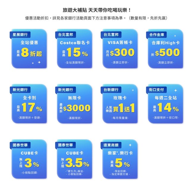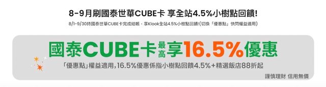 下半年有出遊規劃可以參考看看 Klook銀行優惠天天85折起 8-9月刷Cube卡最高16.5% 透過Line購買可以再拿Line Points點數 https://reurl.cc/NlAarm https://i.imgur.com/fpJRO5g.jpeg