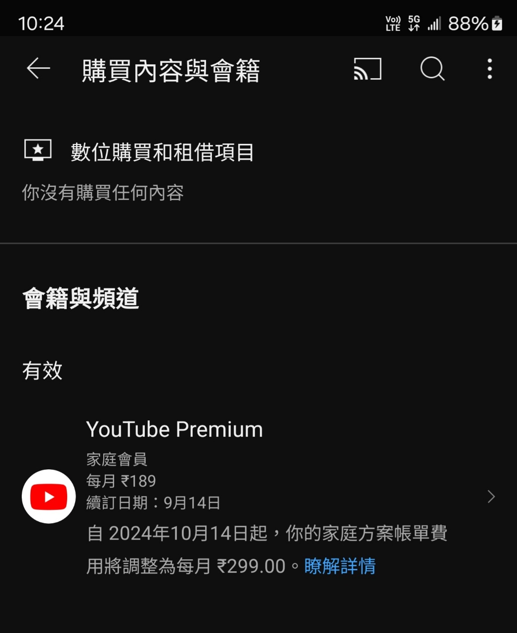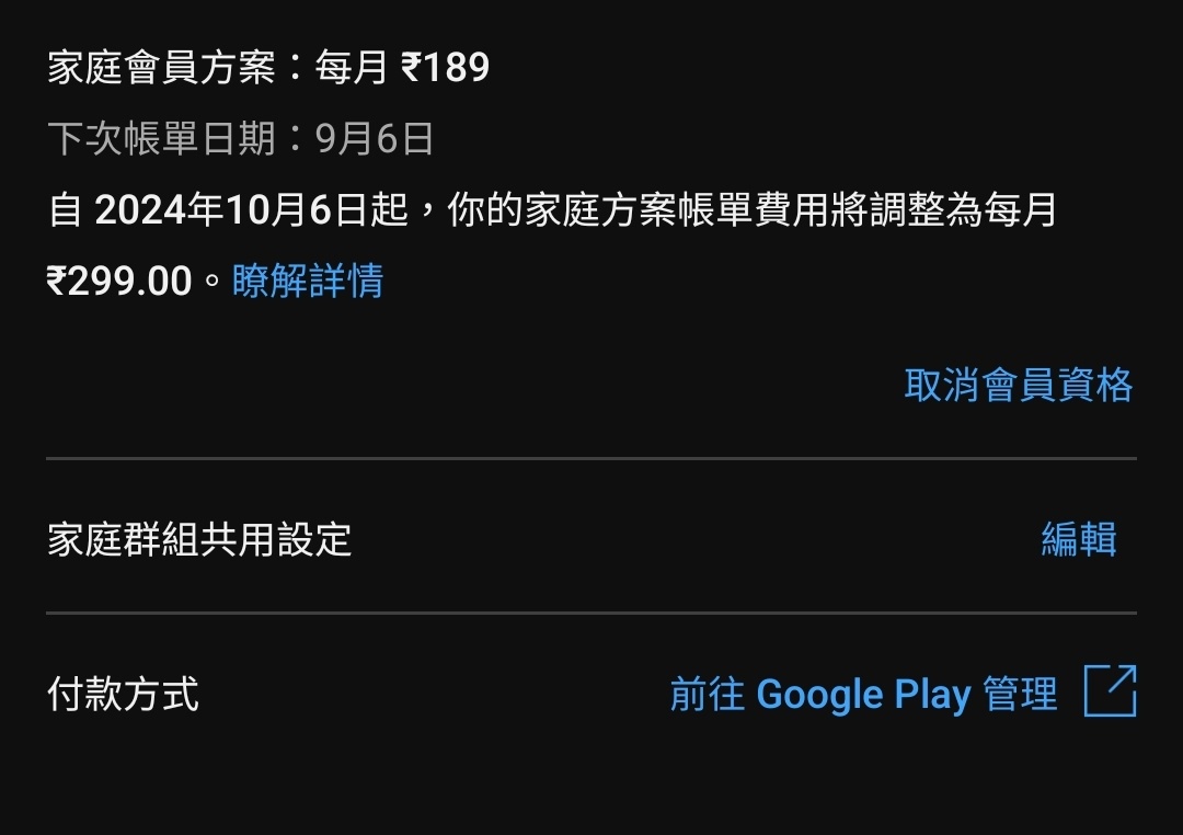 剛剛收到信通知 家庭方案從 INR 189/月 -> INR 299 /月 https://i.imgur.com/1pi0Y0v.jpeg