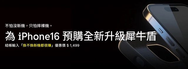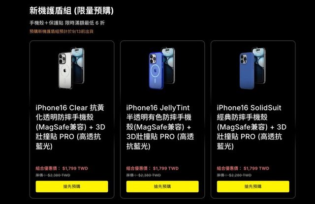 https://shop.rhinoshield.tw/featured/iphone-16 活動日期:2024/8/21 至 2024/9/11 新機護盾組(預購) iPhone16 Clear / JellyTint / SolidSuit手機殼(MagSafe兼容) 任一型號 + 3D壯撞貼 PRO(高透抗藍光) $1,799 https://i.imgur.com/aJmfKNW.jpg