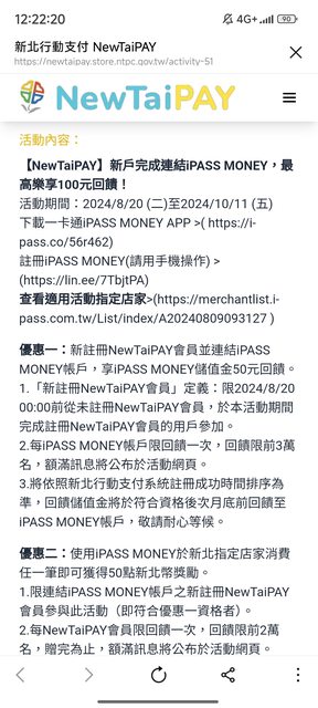 【NewTaiPAY】新戶完成連結iPASS MONEY,最高樂享100元回饋! 活動期間:2024/8/20 (二)至2024/10/11 (五) 優惠一:新註冊NewTaiPAY會員並連結iPASS MONEY帳戶,享iPASS MONEY儲值金50元回饋。 優惠二:使用iPASS MONEY於新北指定店家消費任一筆即可獲得50點新北幣獎勵。 https://reurl.cc/2jEq1E https://i.imgur.com/L0PmCep.jpeg