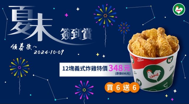 集10章:可領取拿坡里炸雞店-義式炸雞買6送6券。(共12塊348元,平均一塊29元) https://i.imgur.com/j5oHYfy.jpeg