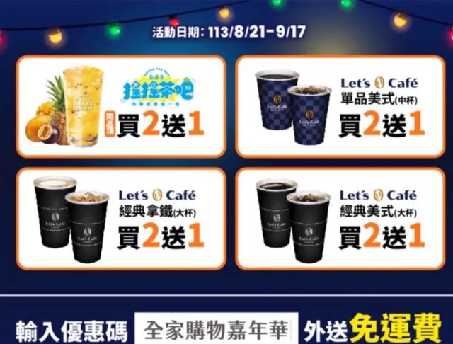 搖搖茶吧同品項買2送1 單品美式中杯、經典拿鐵/美式大杯買2送1 輸入優惠碼“全家購物嘉年華”外送免運 活動到9/17 外送免運還不賴 -- ※ 發信站: 批踢踢實業坊(www.ptt-club.com.tw), 來自: 61.216.103.204 (臺灣) ※ 文章網址: https://www.ptt-club.com.tw/Lifeismoney/M.1726029219.A.0D5