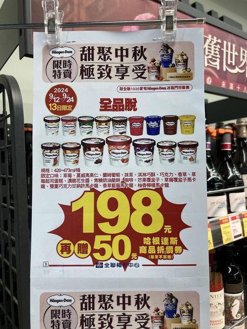 9/12~9/24 全聯 哈根達斯品脱裝 一罐198元 很多口味有特價 看圖片比較快 https://i.imgur.com/lHbcseM.jpeg