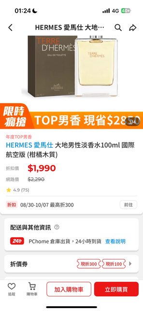 PCHOME 9/13 單日限定 HERMES 愛馬仕 大地男性淡香水100ml 國際航空版 (柑橘木質)$1990 屌打一堆拍賣賣家 而且下面的評價看起來都還算不錯 分享給各位參考了~ 拍謝沒看清楚就上來分享,因為之前在專櫃上購買差不多也要3000左右 看到便宜的價格就分享一波,不是故意要騙的QQ https://i.imgur.com/CMlvami.jpeg
