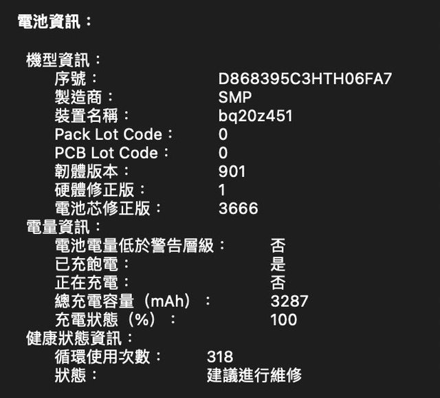 電池循環度318次 狀態為建議維修