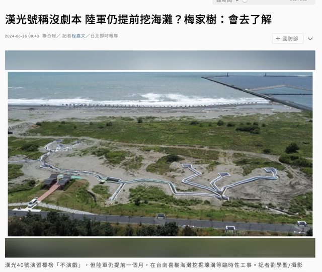 “漢光號稱沒劇本 陸軍仍提前挖海灘?”報導標題