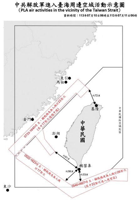 ,自昨天上午6時起至今天上午6時止,計有共機56架次逾越海峽中線侵擾周邊空域並與山