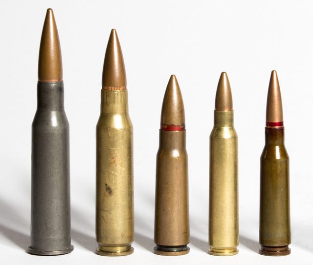 由左至右:.30卡賓槍彈、7.92x33 kurz、7.62x39mm M43、5.45x39mm M74、