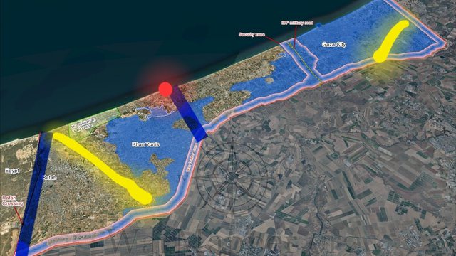 (示意圖黃線更理想地劃出Beit Hanoun-加薩市、Khan Yunis-Rafah額外走廊)