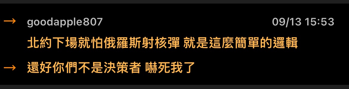 → jayppt : 就鍵盤俠不怕核彈 歐美北約不知怕什麼 收到 09/13 15:15