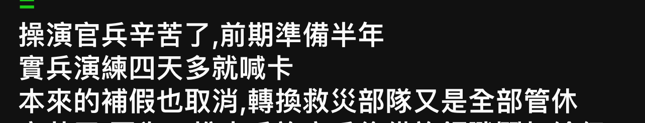 ryanmk2 : 我還以爲國軍有內規說演習沒演完不能補休,看來是沒 10/30 18:43