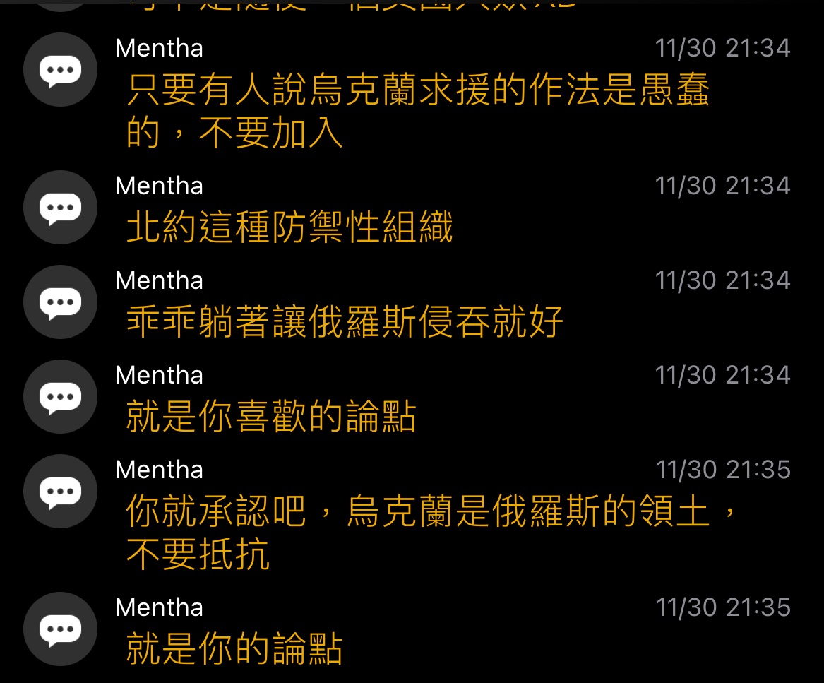 → Mentha : 到現在還在把 烏克蘭當北約當成開戰的藉口 11/30 21:02