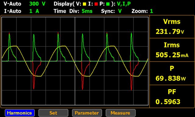 ▼110V輸入下輸出20V/3.3A的交流電壓/電流/功率波形如下圖所示