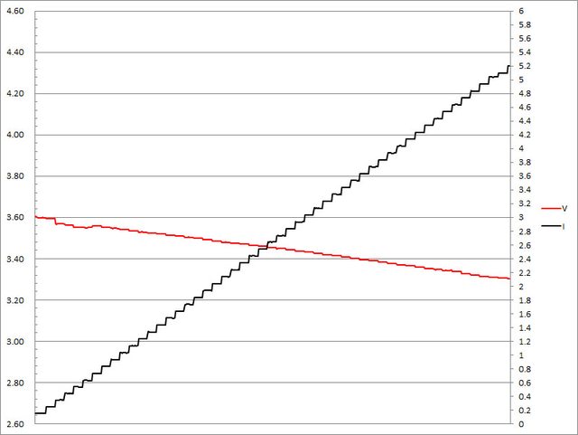 ▼搭配5A線材的第一組小米閃充PPS檔3.6V輸出負載測試,隨著電流增加,輸出電壓下降