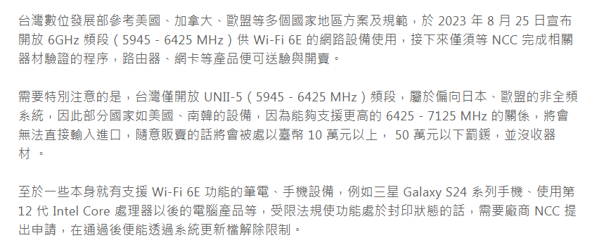 → Hohenzollern: 我國開放Wi-Fi 6的6GHz頻段 為的是Wi-Fi 7第一波先 01/09 23:31