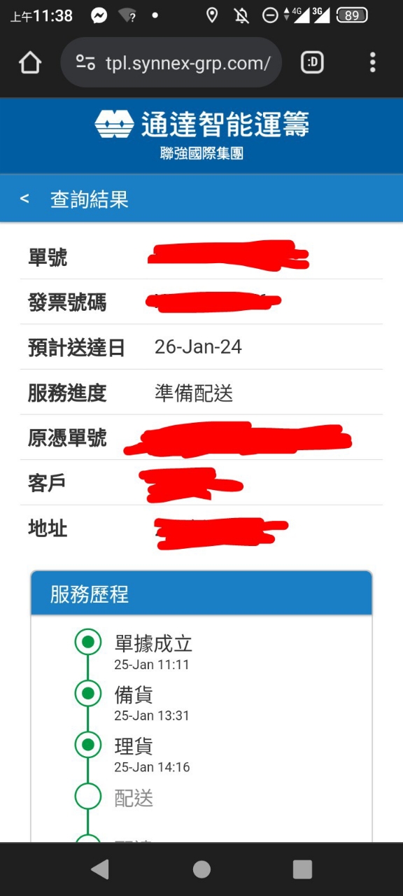 → lovegem : 有動作了,然後預計配達日還是寫在昨天1/26,真諷 01/27 11:39