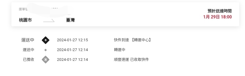 推 imaggieivy00: 早上看也是轉順豐,然後查不到單號,剛剛跳出來了 01/27 12:23