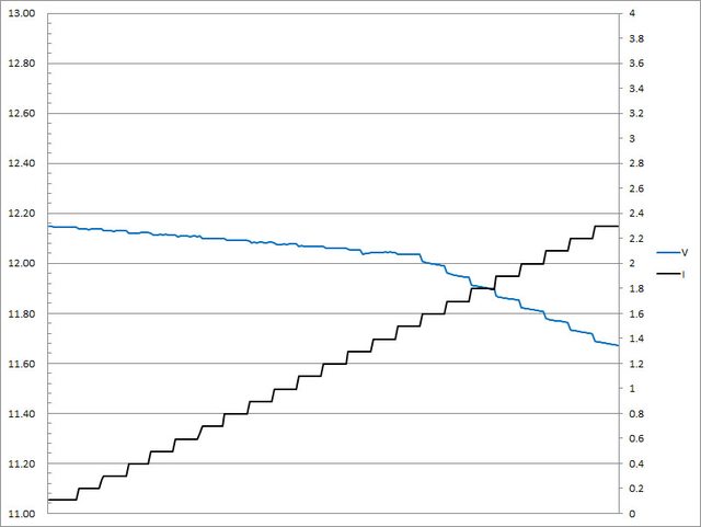 ▼USB-A的12V輸出負載測試,隨著電流增加,輸出電壓下降,輸出電流超過2.3A截止
