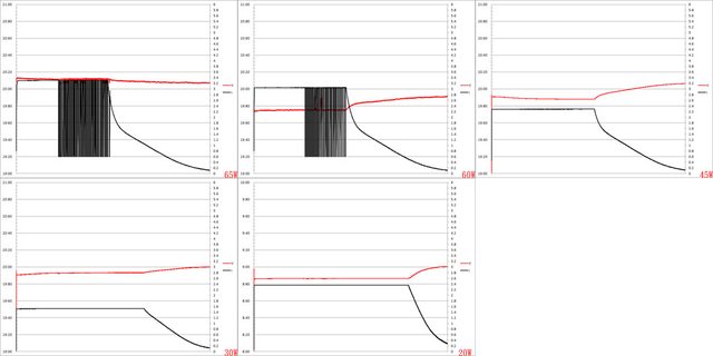 ▼65W/60W/45W/30W/20W輸入充電的電壓電流圖表,65W及60W輸入充電過程中的電流(黑色