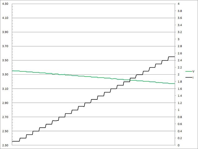 ▼USB-C2的第二組PPS檔3.3V輸出負載測試,隨著電流增加,輸出電壓下降,輸出電流超