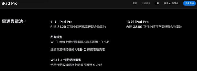 續航部分 Apple 號稱每一個機型都有10小時無線上網&影片播放時間 實際上每一台續航還是有落差(Air 4 , Air5 都墊底),12.9吋 M1 M2 Mini-LED 機型也 是續航倒數的,跟Air5半斤八兩 這次M4 雙層OLED續航要等同條件的實測出來才能判斷了 以下列出兩個尺寸iPad Pro歷代的重量和電池(WiFi機型) iPad Pro 12.9 吋(第 1 代 A9X) 713 公克 內建 38.5 瓦特小時可充電鋰聚合物電池 iPad Pro 12.9 吋(第 2 代 A10X Fusion) 677 公克 內建 41 瓦特小時可充電鋰聚合物電池 iPad Pro 12.9 吋(第 3 代 A12X) 631 公克 內建 36.71 瓦特小時可充電鋰聚合物電池 iPad Pro 12.9 吋(第 4 代 A12Z) 641 公克 內建 36.71 瓦特小時可充電鋰聚合物電池 iPad Pro 12.9 吋(第 5 代 M1)Mini-LED 682 公克 內建 40.88 瓦特小時可充電鋰聚合物電池 iPad Pro 12.9 吋(第 6 代 M2)Mini-LED 682 公克 內建 40.88 瓦特小時可充電鋰聚合物電池 iPad Pro 13 吋(第 7 代 M4)串聯式OLED 579 公克 內建 38.99 瓦特小時可充電鋰聚合物電池 — 9.7 吋 iPad Pro (A9X) 437 公克 內建 27.5 瓦特小時可充電鋰聚合物電池 10.5吋 iPad Pro (A10X Fusion) 469 公克 內建 30.4 瓦特小時可充電鋰聚合物電池 11吋 iPad Pro 第一代 (A12X) 468 公克 內建 29.37 瓦特小時可充電鋰聚合物電池 11吋 iPad Pro 第二代 (A12Z) 471 公克 內建 28.65 瓦特小時可充電鋰聚合物電池 11吋 iPad Pro 第三代 (M1) 466 公克 內建 28.65 瓦特小時可充電鋰聚合物電池 11吋 iPad Pro 第四代 (M2) 466 公克 內建 28.65 瓦特小時可充電鋰聚合物電池 11吋 iPad Pro 第五代 (M4) 串聯式OLED 444 公克 內建 31.29 瓦特小時可充電鋰聚合物電池 source: https://www.apple.com/tw/ipad-pro/ https://www.apple.com/tw/ipad-air/ -- ※ 發信站: 批踢踢實業坊(www.ptt-club.com.tw), 來自: 1.200.9.16 (臺灣) ※ 文章網址: https://www.ptt-club.com.tw/iOS/M.1715112210.A.15C ※ 編輯: gary8442 (1.200.9.16 臺灣), 05/08/2024 04:04:42