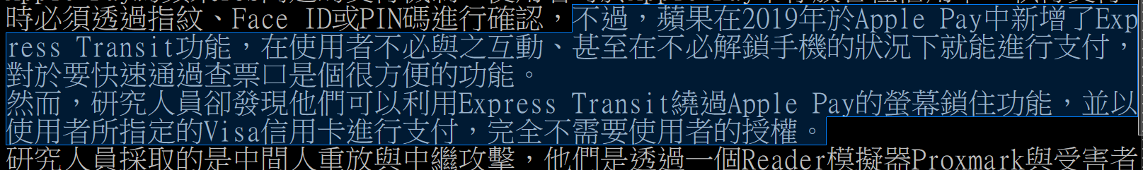 研究人員先後將漏洞通報蘋果及Visa,但兩家業者對於誰該處理漏洞並無共識 新聞 研究:Apple Pay含有Visa信用卡可被盜刷的安全漏洞 研究人員先後將漏洞通報蘋果及Visa,但兩家業者對於誰該處理漏洞並無共識 文/陳曉莉 | 2021-10-01發表 一群安全研究人員本周揭露了Apple Pay的安全漏洞,指稱當啟用Express Transit/Travel 功能時,駭客即可繞過蘋果的安全機制,盜刷使用者的Visa信用卡,然而,蘋果卻說這是Vi sa系統的問題。 Apple Pay為蘋果iOS內建的支付機制,使用者可於Apple Pay中存放各種信用卡,執行支付 時必須透過指紋、Face ID或PIN碼進行確認,不過,蘋果在2019年於Apple Pay中新增了Exp ress Transit功能,在使用者不必與之互動、甚至在不必解鎖手機的狀況下就能進行支付, 對於要快速通過查票口是個很方便的功能。 然而,研究人員卻發現他們可以利用Express Transit繞過Apple Pay的螢幕鎖住功能,並以 使用者所指定的Visa信用卡進行支付,完全不需要使用者的授權。 研究人員採取的是中間人重放與中繼攻擊,他們是透過一個Reader模擬器Proxmark與受害者 的iPhone溝通,再以一支啟用NFC功能的Android手機充當卡片模擬器,以與EMV支付設備通 訊,為了建立Proxmark與卡片模擬器之間的連結,研究人員先將Proxmark以USB連至一臺筆 電,再以筆電將訊息透過Wi-Fi連至卡片模擬器,或者Proxmark也能直接透過藍牙來連結卡 片模擬器。 在一段展示影片中,研究人員成功地從一支鎖住的iPhone上盜刷了1,000歐元。 有趣的是,這群研究人員分別在去年10月與今年5月,將此一漏洞回報給蘋果及Visa,但這 兩家業者對於誰該對此一漏洞負責卻未達到共識。 BBC取得了蘋果與Visa的回應,其中,蘋果認為這是Visa系統的問題,Visa亦明白表示,非 接觸支付的詐騙手法早在10年前就出現在實驗室中,也已被證明它要在實體世界中執行大規 模的攻擊是不可行的。 根據雙方的說法,行動支付或非接觸支付的交易過程中有著重重的安全機制,再不濟Visa也 提供了持卡人零責任政策,不向被盜刷的受害者收款。 換言之,蘋果與Visa目前似乎不打算修補該漏洞,不過,研究人員建議使用者最好不要指定 Visa信用卡作為Express Transit的支付工具,以保障自身的權益。 https://www.ithome.com.tw/news/147013 備註 非果粉 : Who cares 蘋果用戶這麼多 資安問題還能推皮球 果粉 : Who cares me too 潮就好 -- ※ 發信站: 批踢踢實業坊(www.ptt-club.com.tw), 來自: 59.127.17.214 (臺灣) ※ 文章網址: https://www.ptt-club.com.tw/MobileComm/M.1716697764.A.098 ※ 編輯: wattswatts (59.127.17.214 臺灣), 05/26/2024 12:29:50