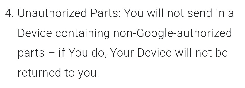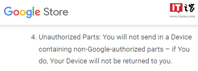 1.原文連結:連結過長者請使用短網址。 https://www.ithome.com/0/773/019.htm 2.原文標題:標題須完整寫出且須符合內文(否則依板規刪除並水桶)。 直接“沒收”!換過非官方部件的 Pixel 手機送去官方維修,谷歌將不會退還 3.原文來源(媒體/作者):例:蘋果日報/王大明(若無署名作者則不須) ithome / 汪淼 4.原文內容:請刊登完整全文(否則依板規刪除並水桶)。 IT之家 6 月 4 日消息,根據谷歌商店官方文件,谷歌的服務和維修計劃條款和條件包含 一項規定,如果發現非谷歌授權部件,設備將不會退還給用戶。該規定自 2023 年 7 月 19 日起生效。 這一規定首先在昨日被 YouTube 用戶 Louis Rossmann 發現,隨後引起了網友熱議。谷 歌官方的維修零部件價格一般比較貴,因此一些 DIY 愛好者選擇使用第三方供應商的零 件,但現在看來,用戶一旦更換非谷歌授權部件,就會失去官方維修渠道。 IT之家注意到,三星上個月也被捲入了一場維修爭議,該公司被指強迫獨立維修店提供機 主個人信息,遇到使用第三方配件的機器不僅要拒絕維修,還要向三星“告密”。 截至IT之家發文,谷歌官方暫未給出回應。 5.心得/評論:內容須超過繁體中文30字(不含標點符號)。 https://i.imgur.com/svAvbFv.png