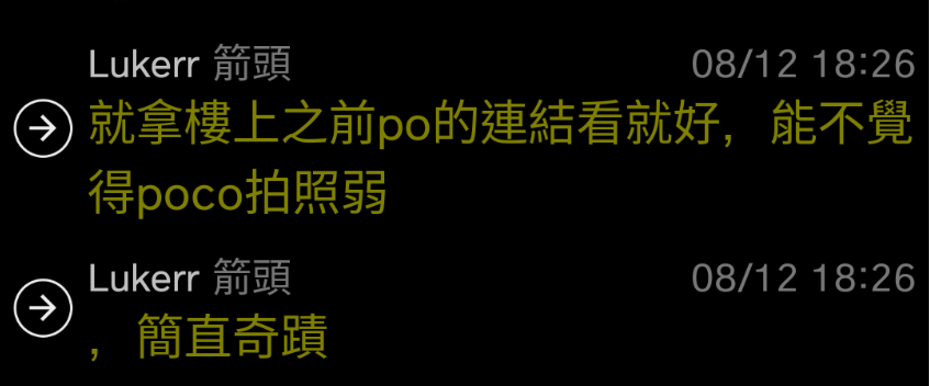 → Lukerr : 不是只有我講啊,大家對poco的拍照評價也都是差 08/12 18:36