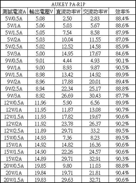 ▼充電器各組輸出轉換效率表,整體輸出轉換效率在84.6%至90.7%之間