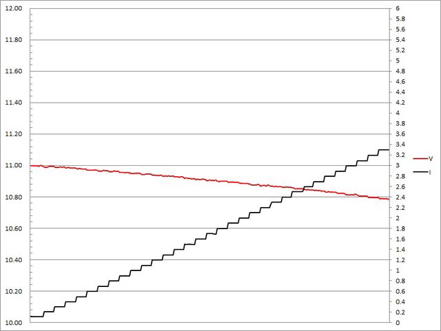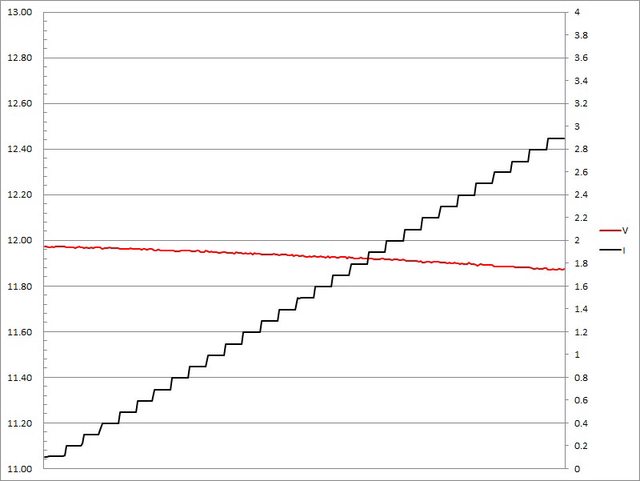 ▼充電器固定檔12V輸出負載測試,電流增加時輸出電壓下降,電流超過2.9A截止