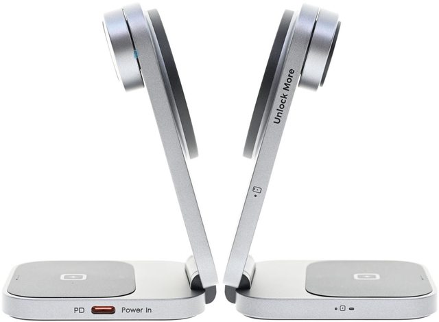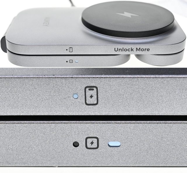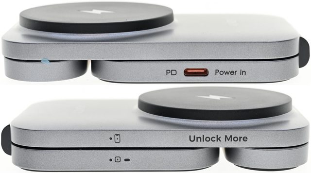 下),底座左側有USB-C PD電源輸入埠(橘色),底座及手機磁吸無線充電盤右側有指示燈