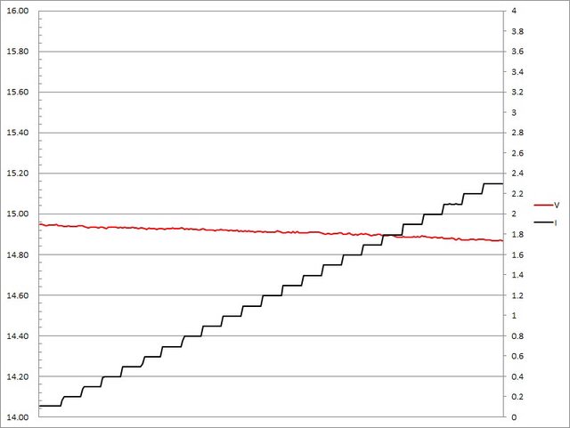 ▼充電器固定檔15V輸出負載測試,電流增加時輸出電壓下降,電流超過2.3A截止