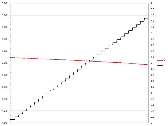 ▼充電器固定檔5V輸出負載測試,電流增加時輸出電壓下降,電流超過3.5A截止