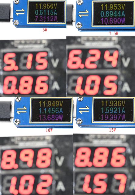 ▼手機磁吸無線充電盤於5W/7.5W/10W/15W輸出下的輸入電壓/電流/功率
