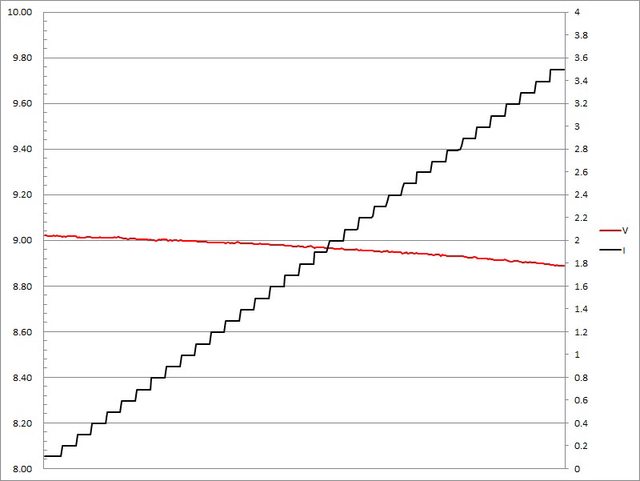 ▼充電器固定檔9V輸出負載測試,電流增加時輸出電壓下降,電流超過3.5A截止