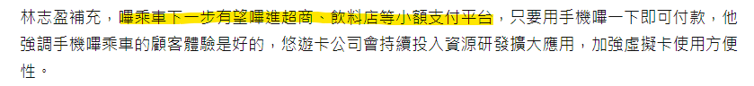 → mf15566 : 這篇新聞有提到之後嗶乘車會有嗶小額商店功能,還有09/27 00:58