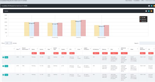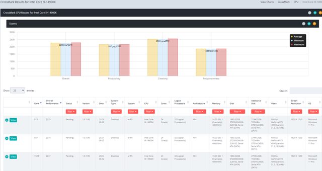 英特爾酷睿 i9-14900K 和 i7-14700K 平均得分為 2265 分和 1980 分。