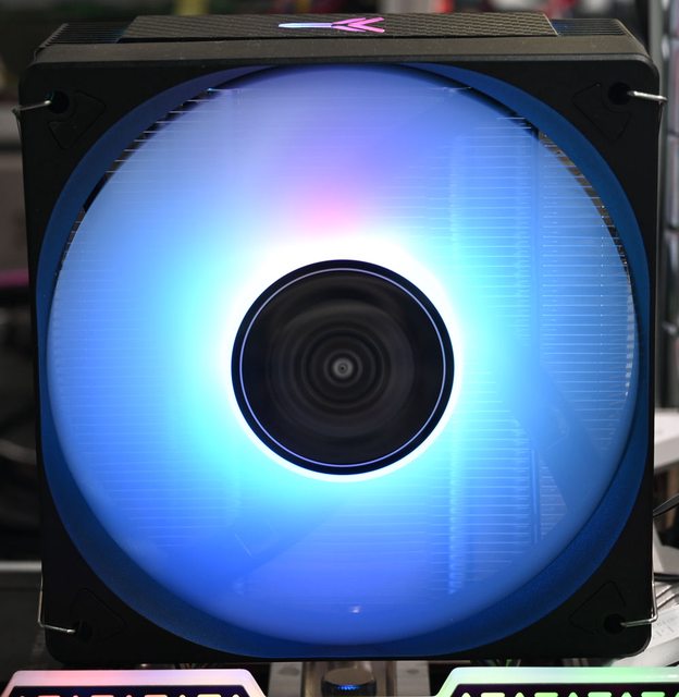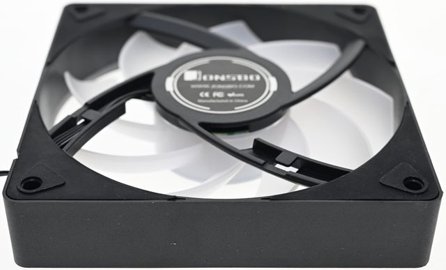 ●鋼絲扣固定的120mm變色發光風扇具備9片乳白色鐮刀形扇葉及8片減震膠墊,4pin PWM