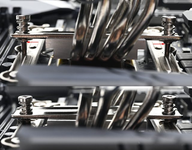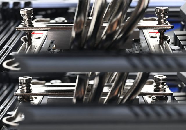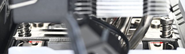 ▼壓板中間用1個手轉螺絲固定在散熱器底座頂部,兩邊設置鎖在托架上的彈簧螺帽