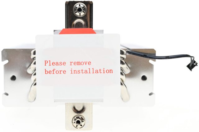 ▼散熱器底座的處理器接觸面有一張保護貼,上面用英文標示”安裝前請移除”