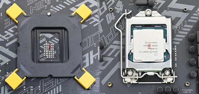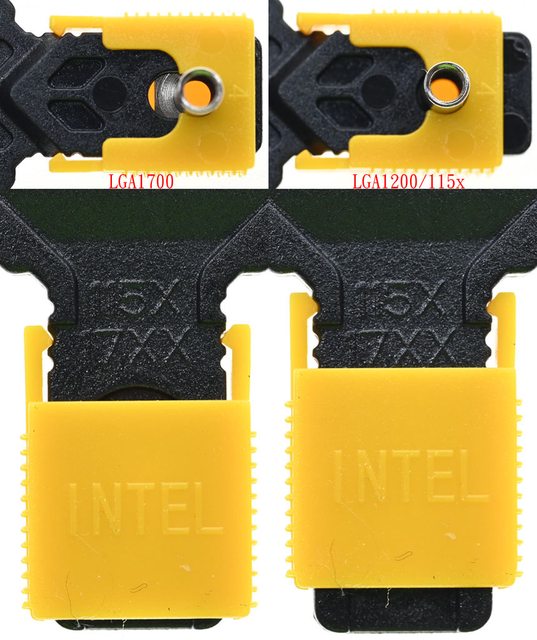 ▼對應LGA1700(左)及LGA1200/115x(右)的固定鎖點及黃色滑套配置示意圖