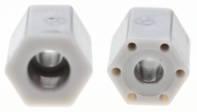 ▼安裝在Intel平台時,需使用灰色套管,其中一端孔洞直徑較大(圖左),另一端孔洞外